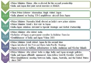 - Global and Strategic Partnership – Japan-India relationship was elevated to the Global and Strategic Partnership when Prime Minister Manmohan Singh visited Japan in December 2006.